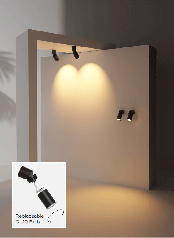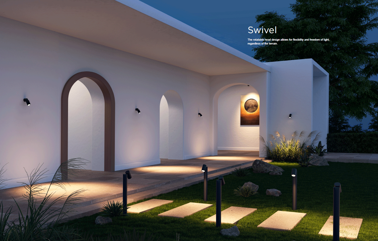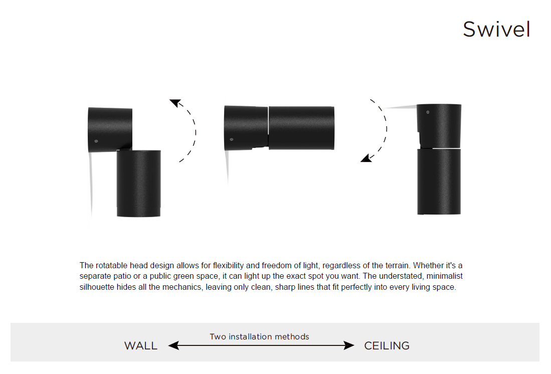 • โคมไฟติดผนังภายนอก Swivel GU10 Outdoor Wall Light ออกแบบในสไตล์โมเดิร์นเรียบหรู สามารถปรับทิศทางของแสงได้ตามต้องการ เหมาะสำหรับการติดตั้งบริเวณผนังบ้าน ผนังอาคาร ทางเดิน หรือพื้นที่ภายนอกอื่น ๆ
