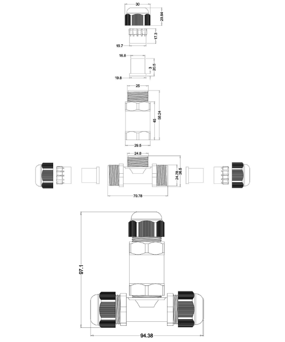 - ข้อต่อสายไฟกันน้ำ3ทาง IP68 TYPE-B