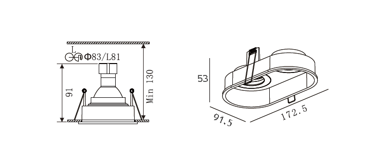 • ขนาดโคม W: 91.5 mm. * L: 172.5 mm. * H: 53 mm.