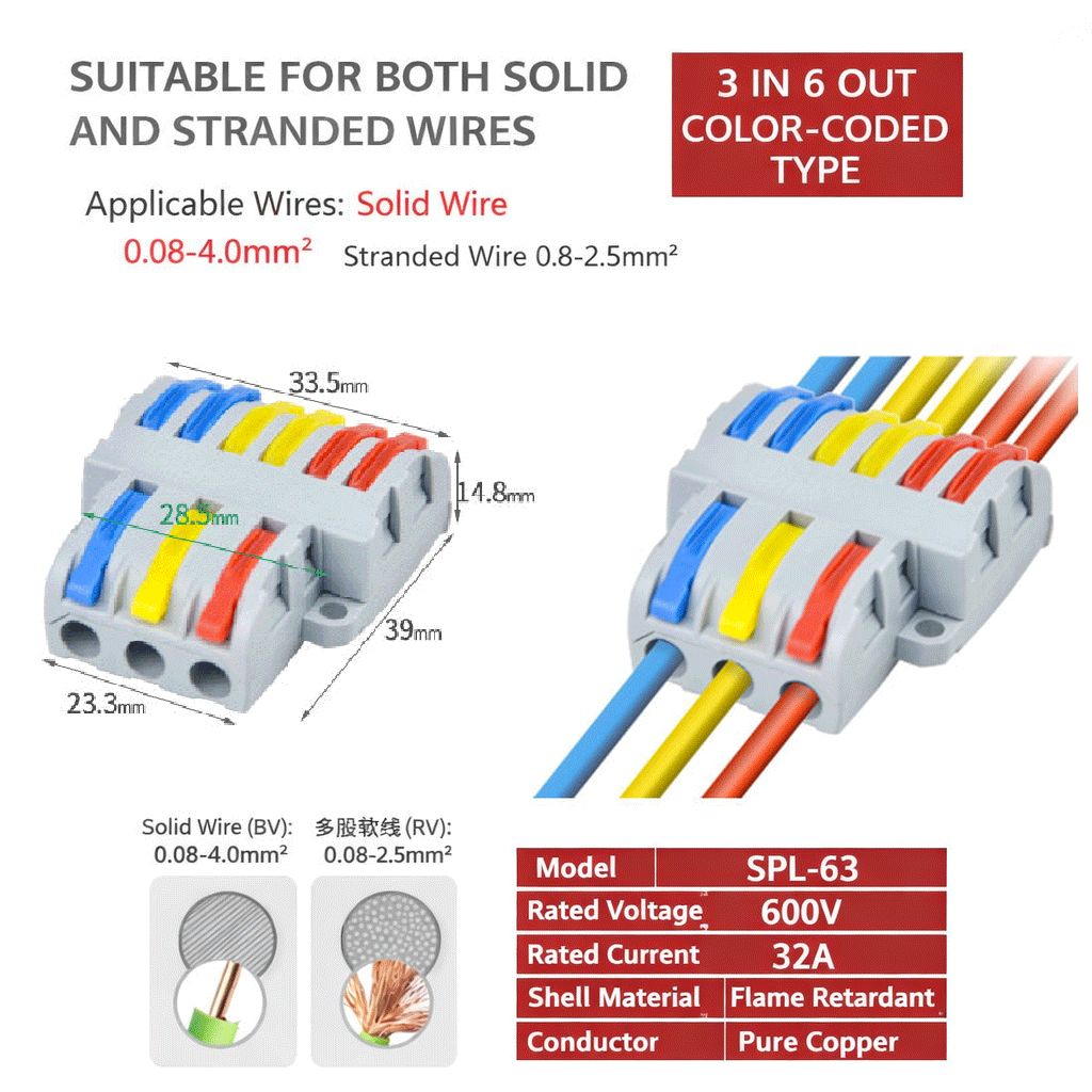 - ข้อต่อสายไฟแบบ Quick connect เข้า 6 ออก 3