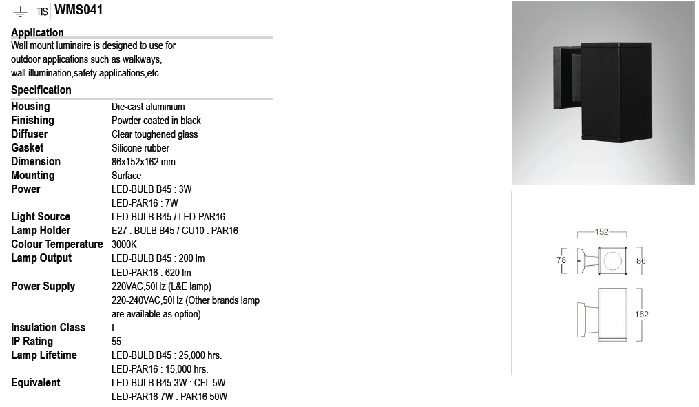 - ขนาดโคม W: 86 mm. * L: 162 mm. * H: 152 mm.