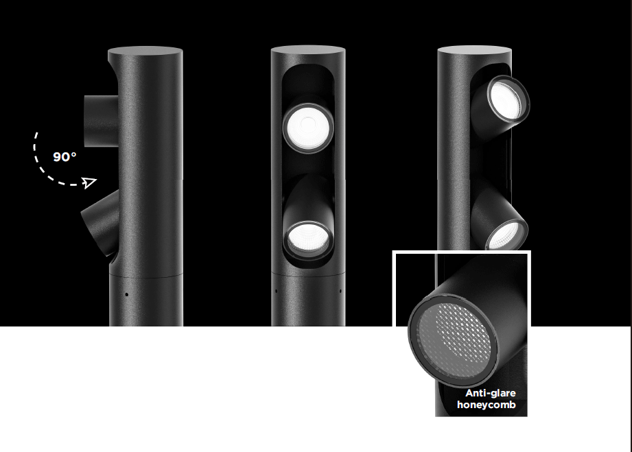 - โคมไฟเสาสนาม ปรับมุมส่องได้ เช่นหัวโคมที่1ปรับส่องต้นไม้สูง หัวโคมที่สองปรับส่องพื้นทางเดิน