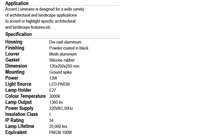 - ใช้ติดตั้งบนพื้นหรือผนัง ส่องสว่างทางเดิน สวน อาคาร