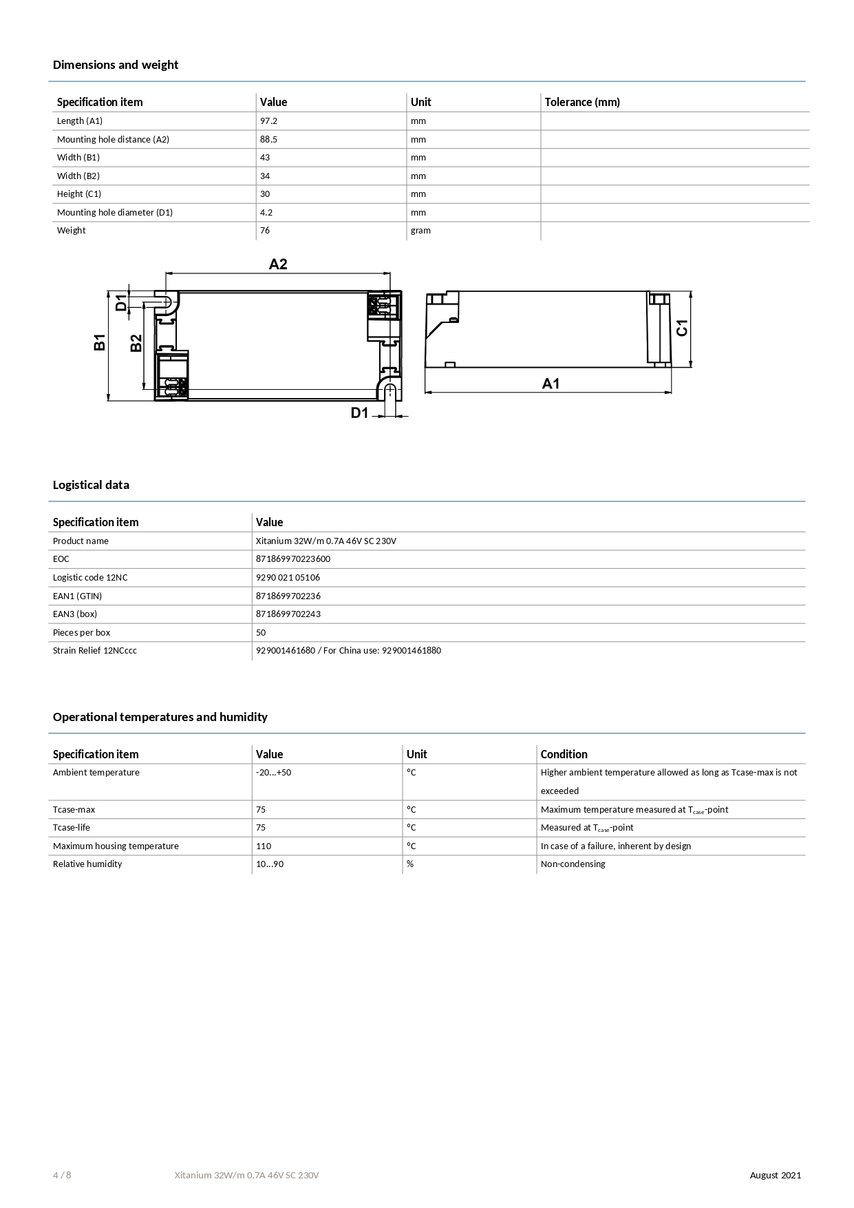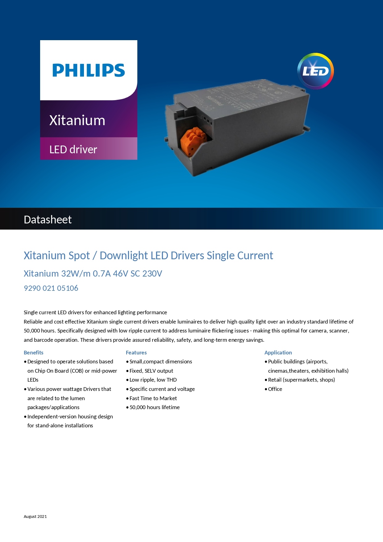 • Download spec sheet Philips Driver Xitanium 32W_m 0.7A 46V SC 230V
