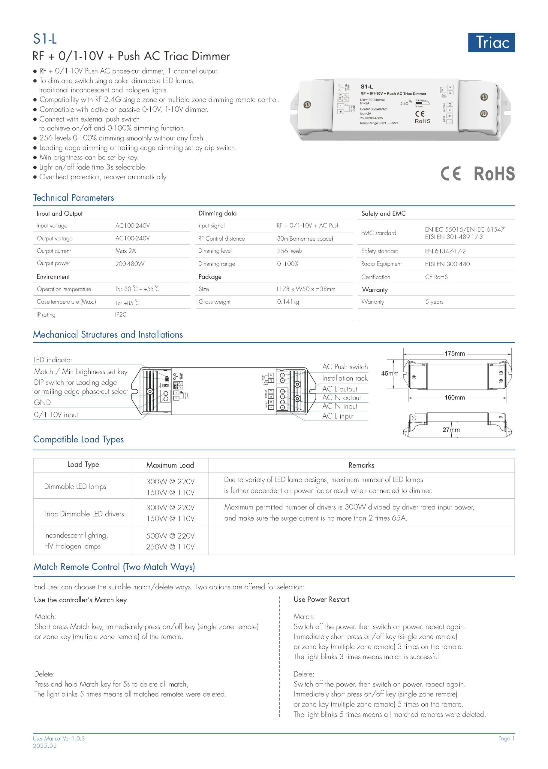 • ดาวน์โหลดสเปค S1-L Dimming RF 0-10V Push-dim Controller